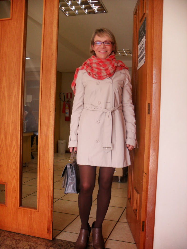 Abrindo a Galeria de Trabalho- Looks do blog Tchô Luiza Antonello, advogada, jornalista e diretora comercial da Empresa Jornalística Planalto Médio Ltda, prefere ítens básicos à efemeridade de tendências. Tchô é uma pessoa simples, auto-confiante, autêntica e natural e como look de trabalho sugere um trench coat, que se encaixa como uma luva, ítem chave para qualquer época fria ou temperada e até em baixo d’agua, adquirido em uma viagem a Milão. Meia fio 40 e ankle boots marrons. Echarpe xadrez, orange & bege, must have em qualquer closet. Suéter argyle, padrão clássico da malharia..Bolsa estruturada, em couro grafite e detalhe bege. Óculos Guess, revela sua personalidade comprometida com o trabalho e muita seriedade profissional. Rola o mouse e confira!!!