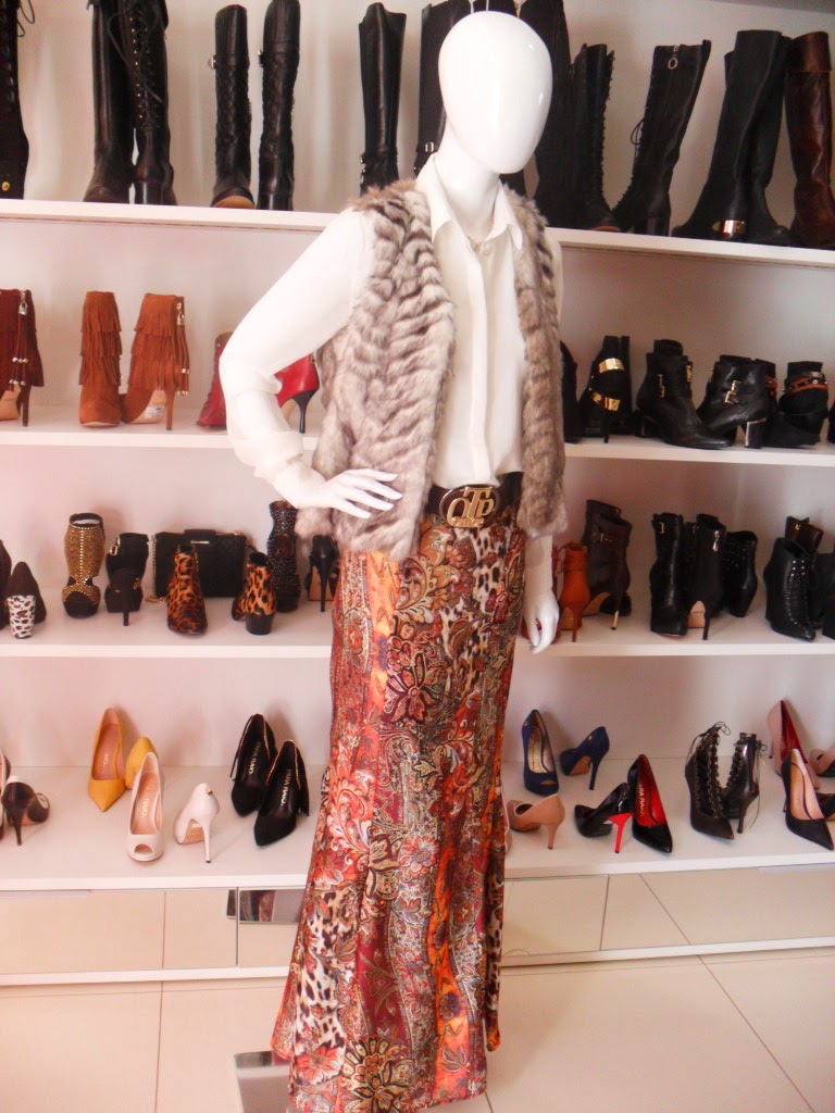 Saia, Mix de Estampas, Colete de Pelo – Angélica Favoreto, Camisa em Crepe de Seda, Off White – Carmim